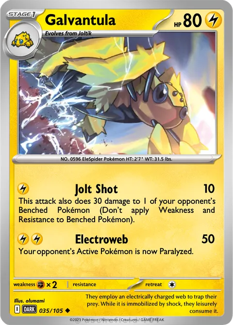 NO. 0596 EleSpider Pokémon HT: 2'7" WT: 31.5 lbs.illus. ołumami#035/105They employ an electrically charged web to trap their prey. While it is immobilized by shock, they leisurely consume it.Created by @GlitcheBoy06 on 28 December 2025Includes assets by Creatures Inc.