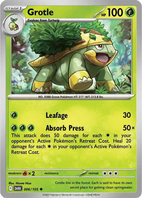 NO. 0388 Grove Pokémon HT: 3'7" WT: 213.8 lbs.illus. Nisota Niso#006/105Grotle live in the forest. Each is said to have its own secret place for getting clean springwater.Created by @GlitcheBoy06 on 28 December 2025Includes assets by Creatures Inc.