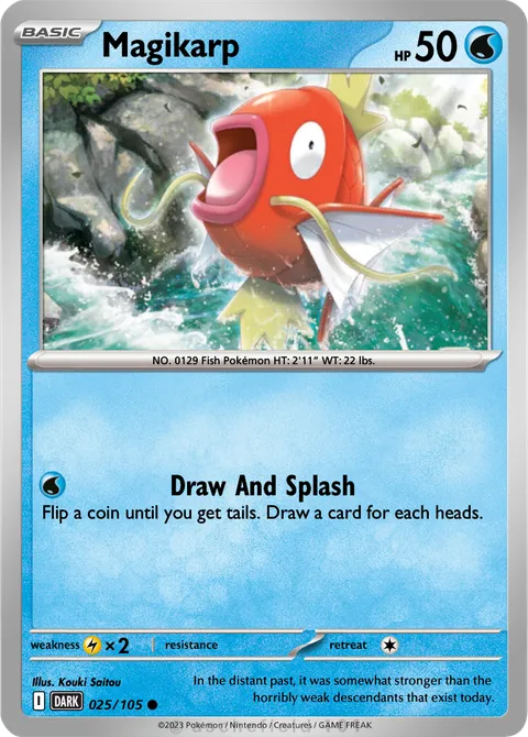 NO. 0129 Fish Pokémon HT: 2'11” WT: 22 lbs.illus. Kouki Saitou#025/105In the distant past, it was somewhat stronger than the horribly weak descendants that exist today.Created by @GlitcheBoy06 on 28 December 2025