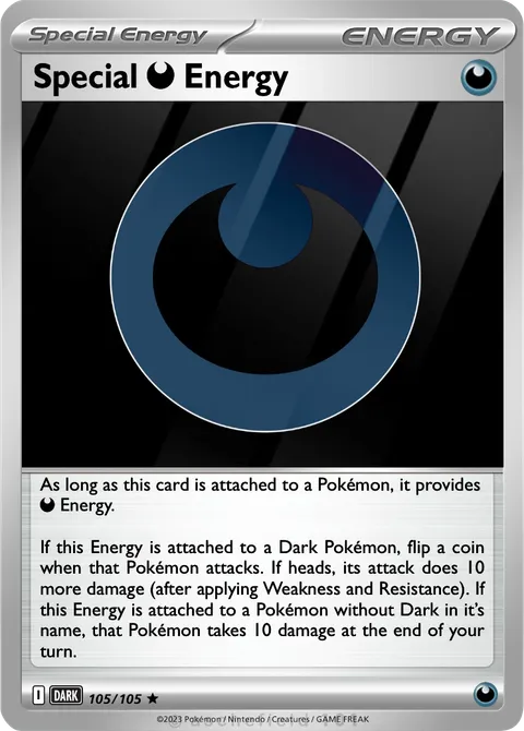 As long as this card is attached to a Pokémon, it provides D Energy. If this Energy is attached to a Dark Pokémon, flip a coin when that Pokémon attacks. If heads, its attack does 10 more damage (after applying Weakness and Resistance). If this Energy is attached to a Pokémon without Dark in it’s name, that Pokémon takes 10 damage at the end of your turn.