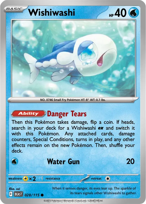 Then this Pokémon takes damage, flip a coin. If heads, search in your deck for a Wishiwashi e and switch it with this Pokémon. Any attached cards, damage counters, Special Conditions, turns in play, and any other effects remain on the new Pokémon. Then, shuffle your deck.Water Gun • 20