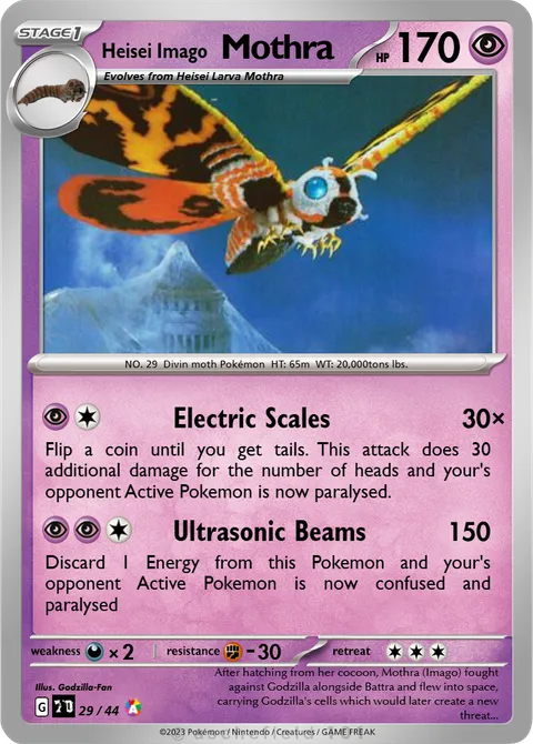 NO. 29 Divin moth Pokémon HT: 65m WT: 20,000tons lbs.illus. Godzilla-Fan#29/44After hatching from her cocoon, Mothra (Imago) fought against Godzilla alongside Battra and flew into space, carrying Godzilla's cells which would later create a new threat...Created by @Godzilla-Fan on 03 January 2025Includes assets by Creatures Inc.