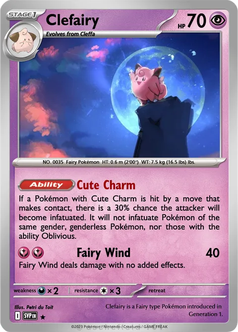 NO. 0035 Fairy Pokémon HT: 0.6 m (2′00″) WT: 7.5 kg (16.5 lbs) lbs.illus. Petri du ToitClefairy is a Fairy type Pokémon introduced in Generation 1.Created by @Gr1MMsnArl on 11 December 2025
