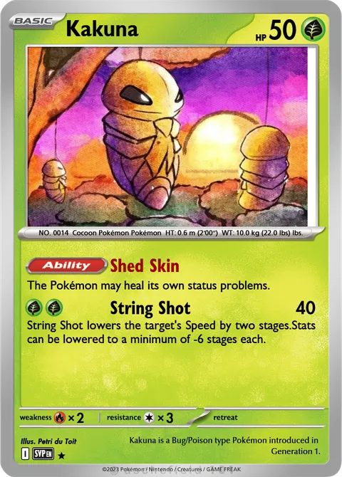 NO. 0014 Cocoon Pokémon Pokémon HT: 0.6 m (2′00″) WT: 10.0 kg (22.0 lbs) lbs.illus. Petri du ToitKakuna is a Bug/Poison type Pokémon introduced in Generation 1.Created by @Gr1MMsnArl on 08 December 2025