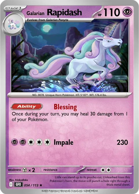 NO. 0078 Unique Horn Pokémon HT: 5′07″ WT: 176.4 lbs.illus. frinkydinks#054/113Little can stand up to its psycho cut. Unleashed from this Pokémon’s horn, the move will punch a hole right through a thick metal sheet.Created by @Greatest_Foes_Set on 21 May 2025