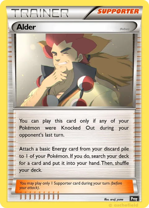You can play this card only if any of your Pokémon were Knocked Out during your opponent's last turn. Attach a basic Energy card from your discard pile to 1 of your Pokémon. If you do, search your deck for a card and put it into your hand. Then, shuffle your deck.
