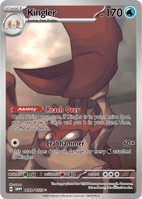 Once during your turn, if Kingler is in your Active Spot, you may draw 6 cards and put 2 in your hand. Then, shuffle your deck.Crabhammer • 60×