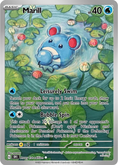 NO. 0183 Aqua Mouse Pokémon HT: 1'4'' WT: 18.7 lbs.illus. sowsow#Proxy 1st edition"Marill Swimming" - Johto expression meaning, "completely relaxing" Created by @Hadran117 on 15 March 2025