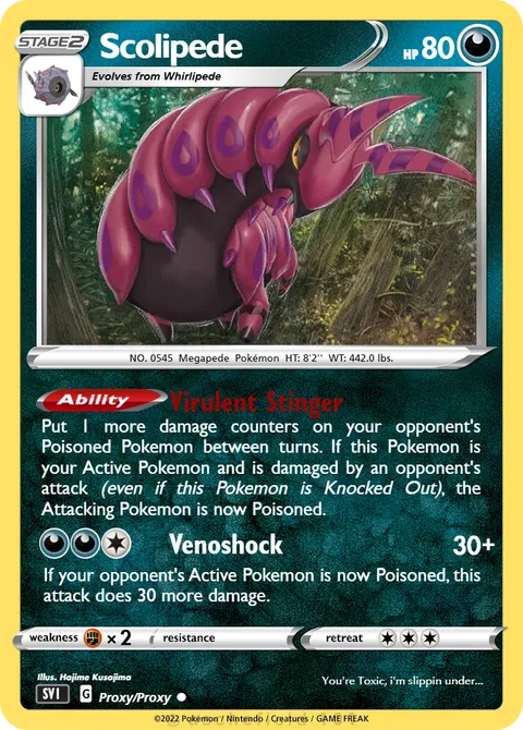 Put 1 more damage counters on your opponent's Poisoned Pokemon between turns. If this Pokemon is your Active Pokemon and is damaged by an opponent's attack (even if this Pokemon is Knocked Out), the Attacking Pokemon is now Poisoned.Venoshock • 30+