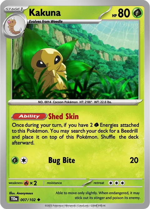 Once during your turn, if you have 2 G Energies attached to this Pokémon. You may search your deck for a Beedrill and place it on top of this Pokémon. Shuffle the deck afterward.Bug Bite • 20