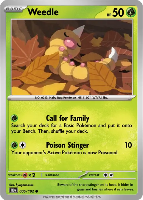 NO. 0013 Hairy Bug Pokémon HT: 1' 00" WT: 7.1 lbs.illus. hyogonosuke#006/102Beware of the sharp stinger on its head. It hides in grass and bushes where it eats leaves.Created by @Halley on 11 November 2025