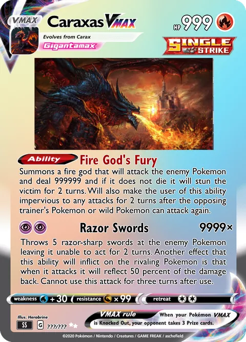 Summons a fire god that will attack the enemy Pokemon and deal 999999 and if it does not die it will stun the victim for 2 turns. Will also make the user of this ability impervious to any attacks for 2 turns after the opposing trainer's Pokemon or wild Pokemon can attack again.Razor Swords • 9999×