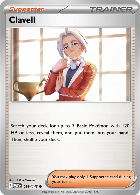 Search your deck for up to 3 Basic Pokémon with 120 HP or less, reveal them, and put them into your hand. Then, shuffle your deck.