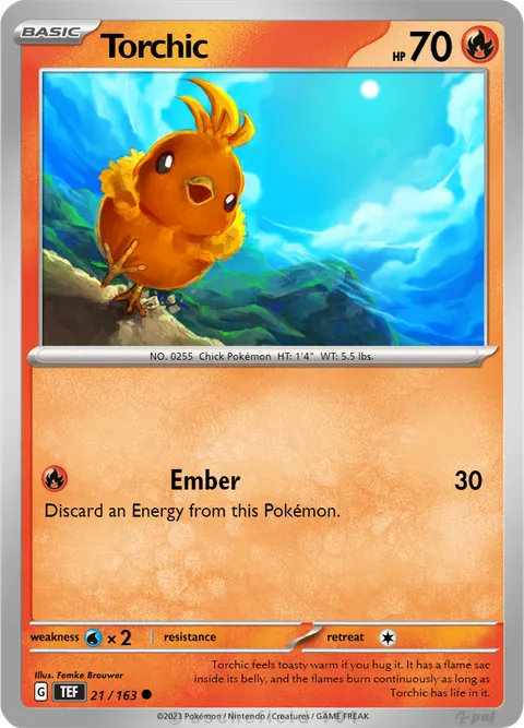 NO. 0255 Chick Pokémon HT: 1'4" WT: 5.5 lbs.illus. Femke Brouwer#21/163Torchic feels toasty warm if you hug it. It has a flame sac inside its belly, and the flames burn continuously as long as Torchic has life in it.Created by @Hopoosucs on 15 January 2024