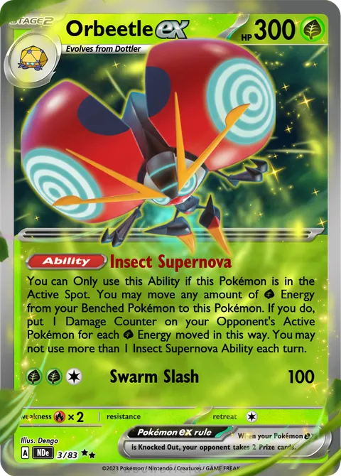 You can Only use this Ability if this Pokémon is in the Active Spot. You may move any amount of G Energy from your Benched Pokémon to this Pokémon. If you do, put 1 Damage Counter on your Opponent's Active Pokémon for each G Energy moved in this way. You may not use more than 1 Insect Supernova Ability each turn.