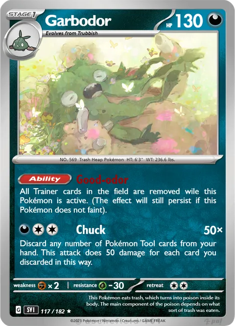 NO. 569 Trash Heap Pokémon HT: 6'3" WT: 236.6 lbs.#117/182This Pokémon eats trash, which turns into poison inside its body. The main component of the poison depends on what sort of trash was eaten.Created by @IamTheTrubbish on 22 November 2023