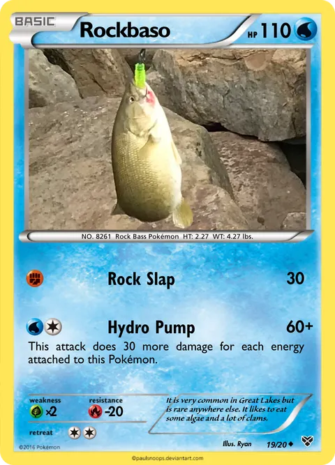 NO. 8261 Rock Bass Pokémon HT: 2.27 WT: 4.27 lbs.illus. Ryan#19/20It is very common in Great Lakes but is rare anywhere else. It likes to eat some algae and a lot of clams.Created by @ImHim on 23 November 2023