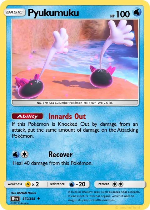NO. 370 Sea Cucumber Pokémon HT: 1'00" WT: 2.6 lbs.illus. BANDAI Namco#370/565It lives in shallow seas, such as areas near a beach. It can eject its internal organs, which it uses to engulf its prey or battle enemies.Created by @InfiniteFusionTCG on 30 May 2025