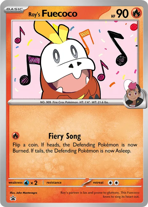 NO. 0909 Fire Croc Pokémon HT: 1' 4" WT: 21.6 lbs.illus. John MontenegroRoy's partner is lax and prone to gluttony. This Fuecoco loves to sing its heart out.Created by @JJTCG on 15 March 2026Includes assets by Creatures Inc.