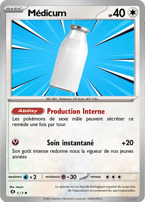 Les pokémons de sexe mâle peuvent sécréter ce remède une fois par tour.Soin instantané • +20