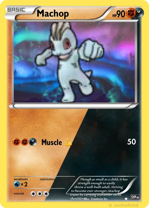 illus. Creatures Inc.Though as small as a child, it has strength enough to easily throw a well-built adult. Striving to become ever stronger, Machop trains by carrying a Graveler on its shoulders.Created by @Jakester2016 on 10 March 2026Includes assets by Creatures Inc.