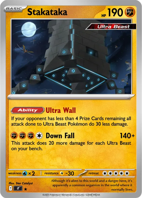If your opponent has less than 4 Prize Cards remaining all attack done to Ultra Beast Pokémon do 30 less damage.Down Fall • 140+