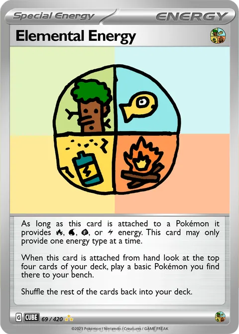 As long as this card is attached to a Pokémon it provides R, W, G, or L energy. This card may only provide one energy type at a time. When this card is attached from hand look at the top four cards of your deck, play a basic Pokémon you find there to your bench. Shuffle the rest of the cards back into your deck.