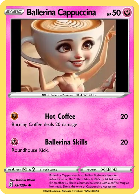 NO. 6 Ballerina Pokémon HT: 4 WT: 78 lbs.illus. Chili Frog Official#79/120+Ballerina Cappuccina is an Italian Brainrot character introduced on the 16th of March, 2025 by TikTok user @ncracfbcr4x. She is a human ballerina with a coffee mug as her head. She is the wife of Cappuccino Assassino.Created by @JimmyChilly on 10 July 2025
