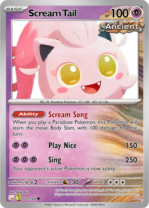 When you play a Paradoxe Pokemon, this Pokemon will learn the move Body Slam, with 100 damage, for one turn.Play Nice • 150