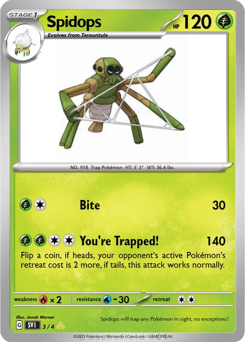 NO. 918 Trap Pokémon HT: 3' 3" WT: 36.4 lbs.illus. Jonah Werner#3/4Spidops will trap any Pokémon in sight, no exceptions!Created by @Jonah_Werner on 01 March 2024