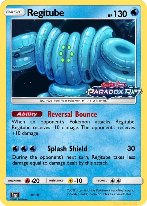 When an opponent’s Pokémon attacks Regitube, Regitube receives -10 damage. The opponent’s receives +10 damage.Splash Shield • 30