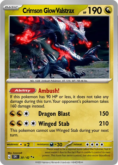 NO. 1328 Ambush Pokémon HT: 13'6 WT: 769.46 lbs.illus. Jsnowzell#30/42There used to be a normal form called the Valstrax, but it went extinct due to the fact that it couldn't control its own power. This form has more control, but also more bloodlust.Created by @Judahsaurus388 on 14 May 2024Includes assets by Creatures Inc.
