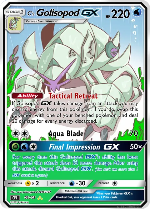 If Golisopod X takes damage from an attack you may discard energy from this pokémon; If you do, swap this pokémon with one of your benched pokémon, and deal 20 damage for every energy discarded.Aqua Blade • 70