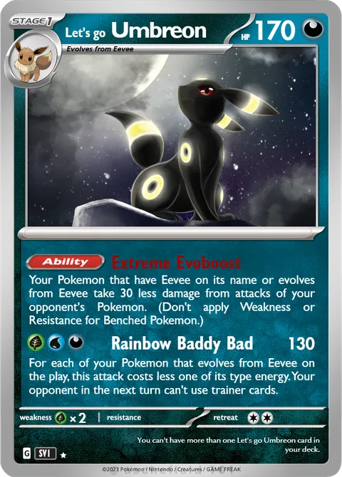 Your Pokemon that have Eevee on its name or evolves from Eevee take 30 less damage from attacks of your opponent's Pokemon. (Don't apply Weakness or Resistance for Benched Pokemon.)Rainbow Baddy Bad • 130