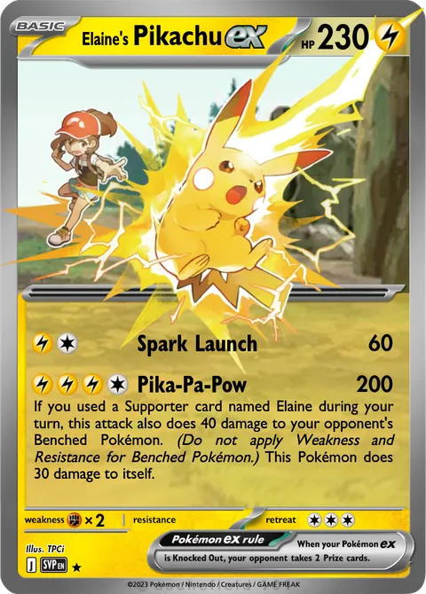 If you used a Supporter card named Elaine during your turn, this attack also does 40 damage to your opponent's Benched Pokémon. (Do not apply Weakness and Resistance for Benched Pokémon.) This Pokémon does 30 damage to itself.