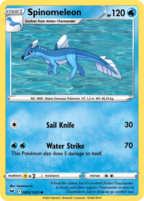 NO. 0005 Water Dinosaur Pokémon HT: 1,2 m WT: 40,10 kgillus. Creatures Inc.#0005/1025It look like a dino, but It's evolved Alolan Charmander. In Kanto and other regions, Charmander evolves to Charmeleon, but in Alola we go another way.Created by @Kasztan_Poksy on 07 January 2026, last edited on 09 January 2026