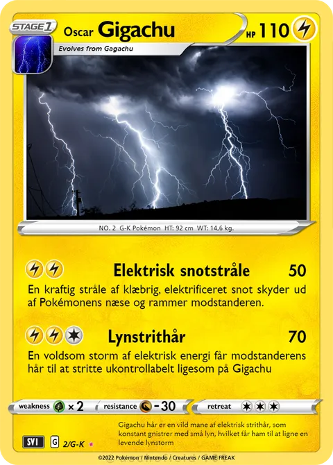 NO. 2 G-K Pokémon HT: 92 cm WT: 14,6 kg.#2/G-KGigachu hår er en vild mane af elektrisk strithår, som konstant gnistrer med små lyn, hvilket får ham til at ligne en levende lynstormCreated by @Khellendros on 05 July 2024