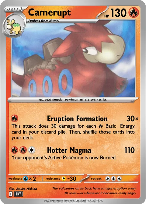 NO. 0323 Eruption Pokémon HT: 6'3 WT: 485 lbs.illus. Atsuko NishidaThe volcanoes on its back have a major eruption every 10 years—or whenever it becomes really angry.Created by @KittyCatViolet379 on 09 November 2025
