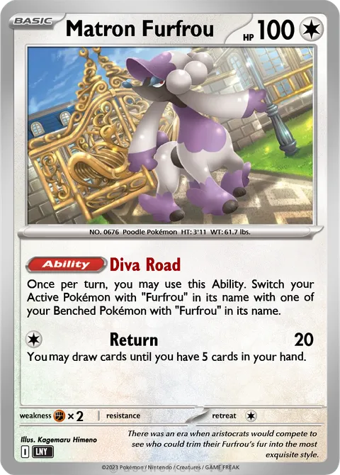 Once per turn, you may use this Ability. Switch your Active Pokémon with "Furfrou" in its name with one of your Benched Pokémon with "Furfrou" in its name.Return • 20