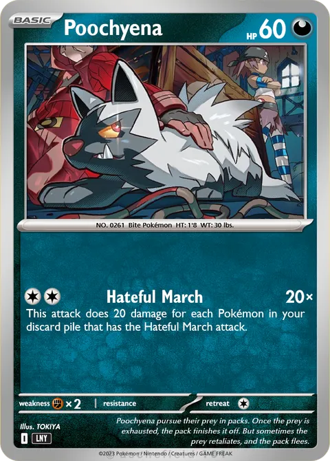 NO. 0261 Bite Pokémon HT: 1'8 WT: 30 lbs.illus. TOKIYAPoochyena pursue their prey in packs. Once the prey is exhausted, the pack finishes it off. But sometimes the prey retaliates, and the pack flees.Created by @KittyCatViolet379 on 01 November 2025