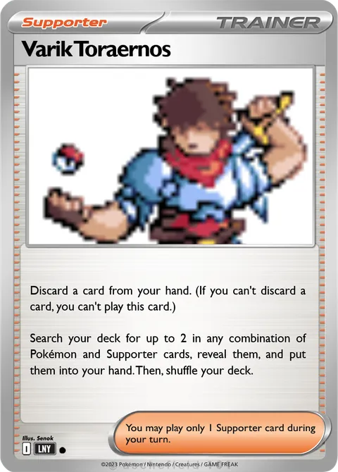 Discard a card from your hand. (If you can't discard a card, you can't play this card.) Search your deck for up to 2 in any combination of Pokémon and Supporter cards, reveal them, and put them into your hand. Then, shuffle your deck.