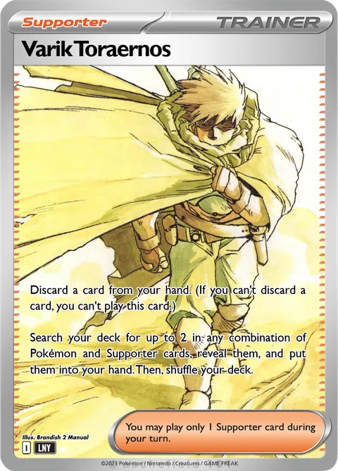 Discard a card from your hand. (If you can't discard a card, you can't play this card.) Search your deck for up to 2 in any combination of Pokémon and Supporter cards, reveal them, and put them into your hand. Then, shuffle your deck.