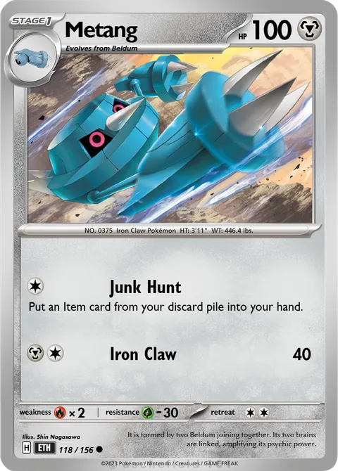 NO. 0375 Iron Claw Pokémon HT: 3'11" WT: 446.4 lbs.illus. Shin Nagasawa#118/156It is formed by two Beldum joining together. Its two brains are linked, amplifying its psychic power.Created by @Knight on 24 February 2025