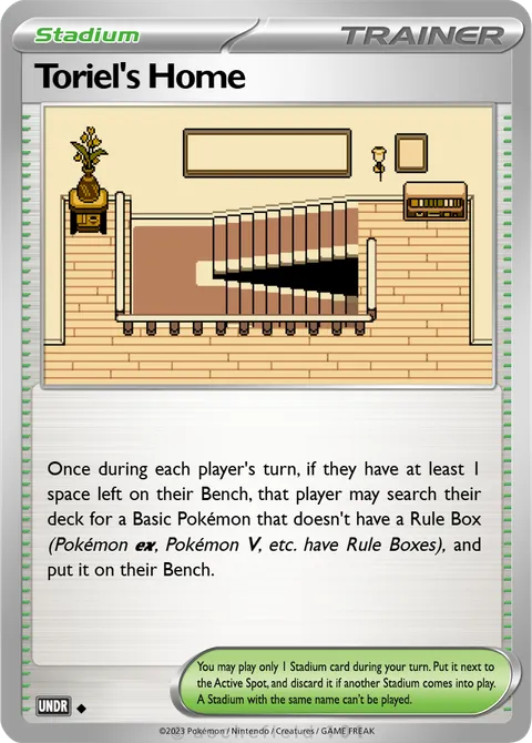 Once during each player's turn, if they have at least 1 space left on their Bench, that player may search their deck for a Basic Pokémon that doesn't have a Rule Box (Pokémon e, Pokémon V, etc. have Rule Boxes), and put it on their Bench.
