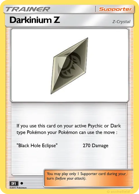 If you use this card on your active Psychic or Dark type Pokémon your Pokémon can use the move : "Black Hole Eclipse" 270 Damage