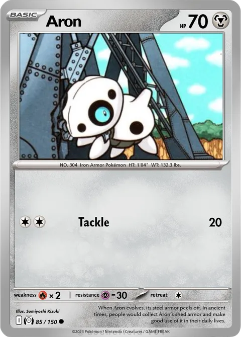 NO. 304 Iron Armor Pokémon HT: 1'04" WT: 132.3 lbs.illus. Sumiyoshi Kizuki#85/150When Aron evolves, its steel armor peels off. In ancient times, people would collect Aron’s shed armor and make good use of it in their daily lives.Created by @LPBvgc on 17 February 2025