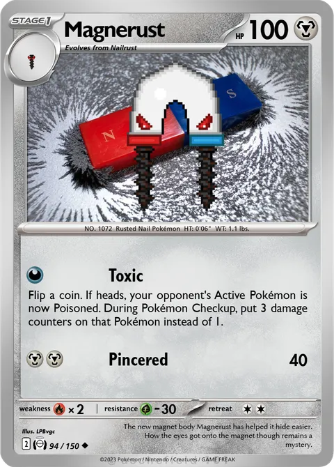 NO. 1072 Rusted Nail Pokémon HT: 0'06" WT: 1.1 lbs.illus. LPBvgc#94/150The new magnet body Magnerust has helped it hide easier. How the eyes got onto the magnet though remains a mystery.Created by @LPBvgc on 17 February 2025