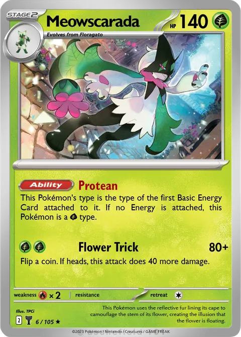 This Pokémon's type is the type of the first Basic Energy Card attached to it. If no Energy is attached, this Pokémon is a G type.Flower Trick • 80+