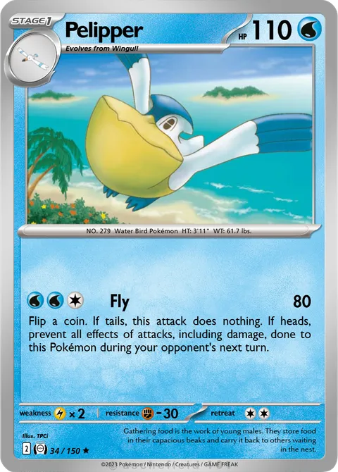 NO. 279 Water Bird Pokémon HT: 3'11" WT: 61.7 lbs.illus. TPCi#34/150Gathering food is the work of young males. They store food in their capacious beaks and carry it back to others waiting in the nest.Created by @LPBvgc on 18 June 2025