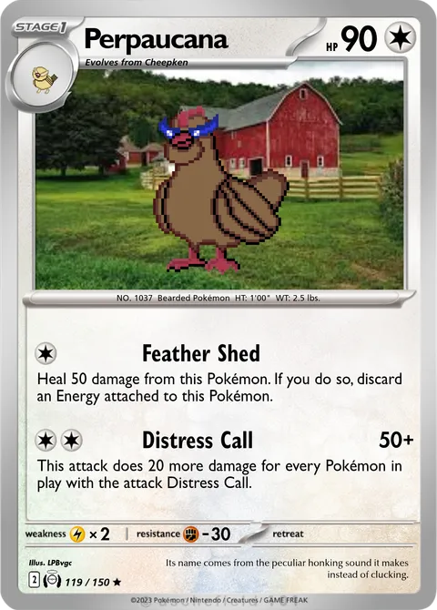 NO. 1037 Bearded Pokémon HT: 1'00" WT: 2.5 lbs.illus. LPBvgc#119/150Its name comes from the peculiar honking sound it makes instead of clucking.Created by @LPBvgc on 14 February 2025